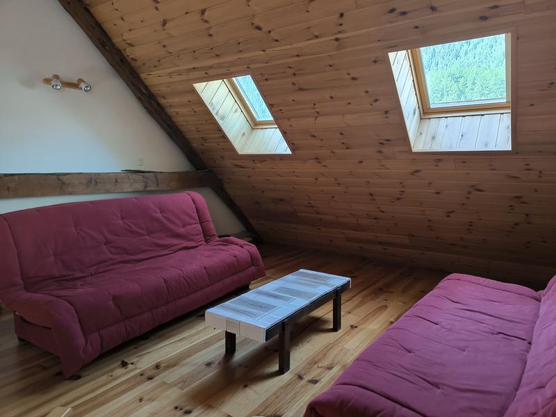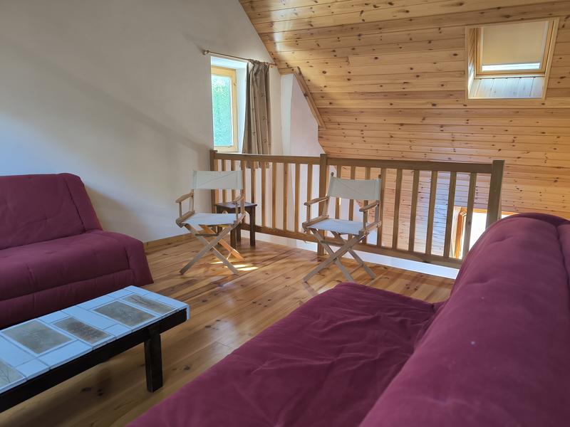 Une mezzanine offre un coin salon spacieux et confortable équipé de deux clics-clacs pouvant